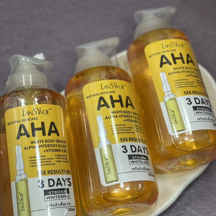 - سرم روشن کننده بدن aha به تدریج آثار باقیمانده از آکنه و لکهها را محو کرده و پوست را صافتر نشان میدهد.